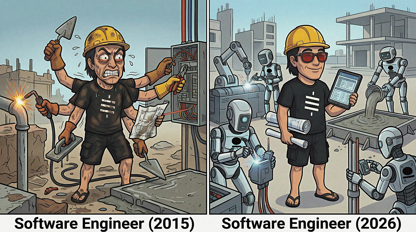 For decades, software engineers did all of it. We designed, and built, and tested, and deployed. We were the architect and the welder and the electrician and the building inspector. No other engineering discipline works that way. Ours did because there was no construction crew to delegate to. A civil engineer hands blueprints to a general contractor. A software engineer was the general contractor. The only way to get from “I know what this should do” to “it works” was to write every line yourself.